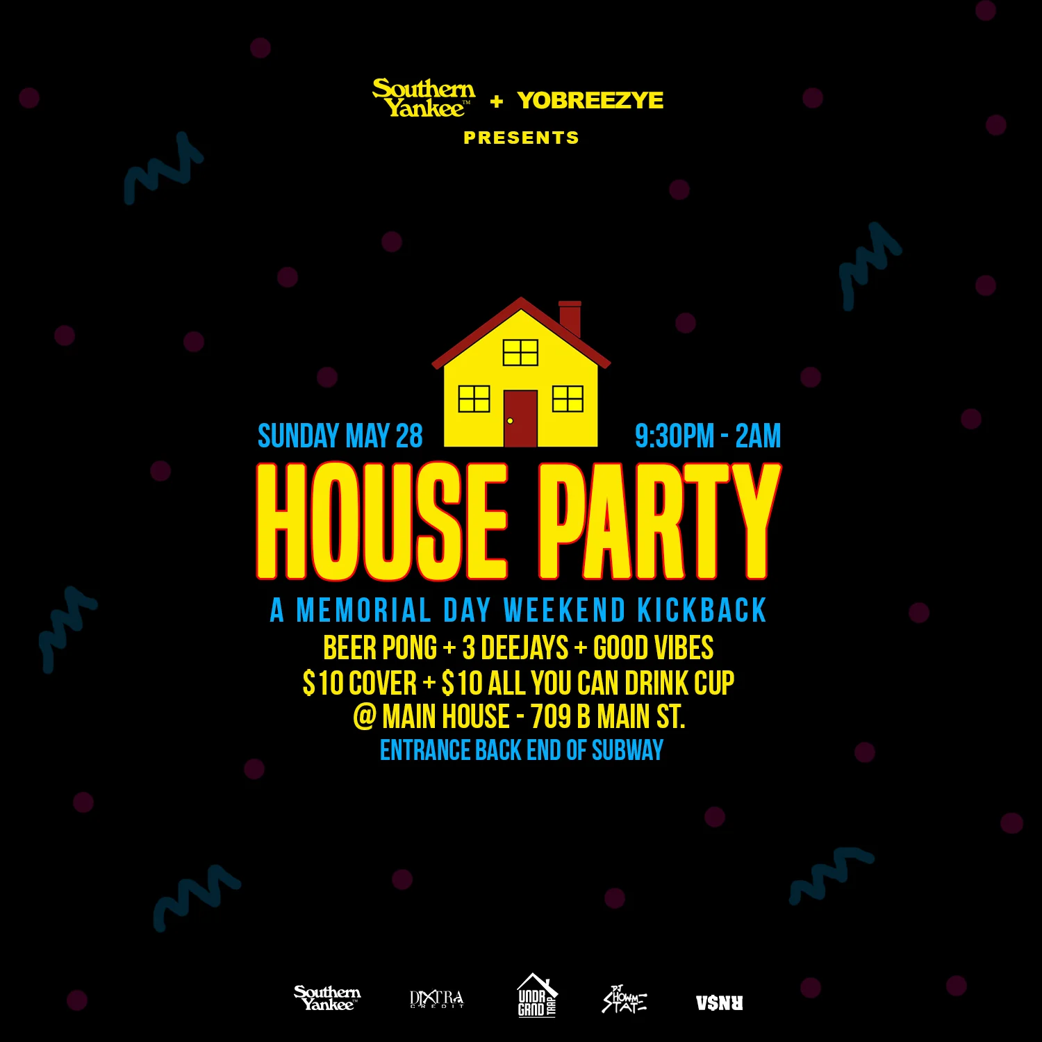 Sunday, May 28th, 2017 Yobreezye & Southern Yankee link for a Memorial Day Weekend Kickback. You can find us at Main Street out East! We'll have beer pong, 3 deejays, and just all around good vibes. Kicks off at 9:30pm.